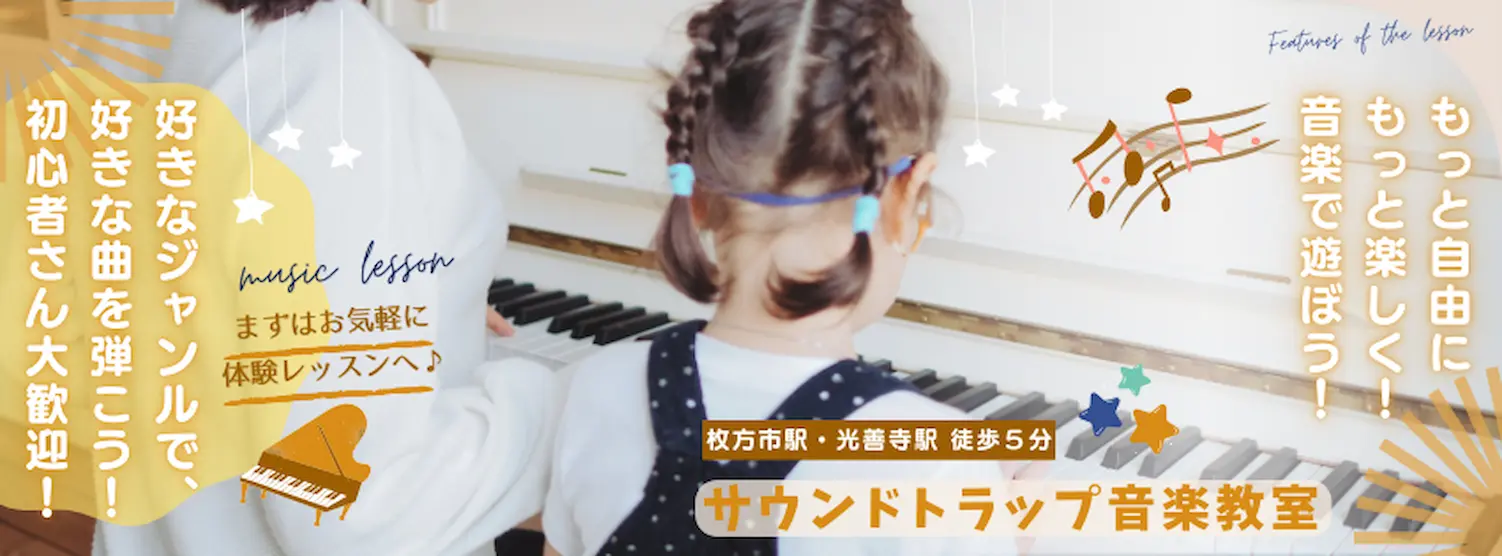 サウンドトラップ音楽教室は、大阪府枚方にある、誰でも気軽に音楽を楽しめる教室です。年齢も音楽のジャンルも関係なく、「やってみたい!」という気持ちがあれば大歓迎♪初心者の方も安心して通っていただけます。